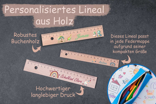 Lineal mit Wunschname aus Holz und vielen Motiven