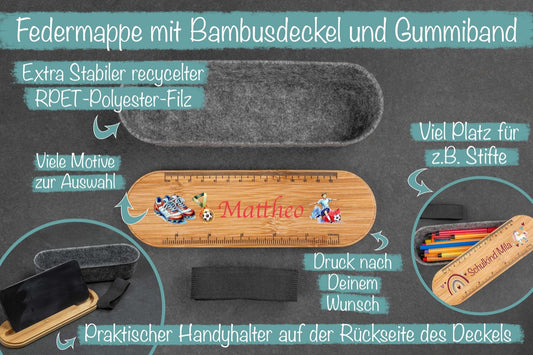 Federmappe perfekt als Box für Stifte aus Filz mit Bambusdeckel und Wunschgravur