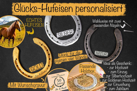 Hufeisen personalisiert mit Gravur und Holzbox - Glückshufeisen