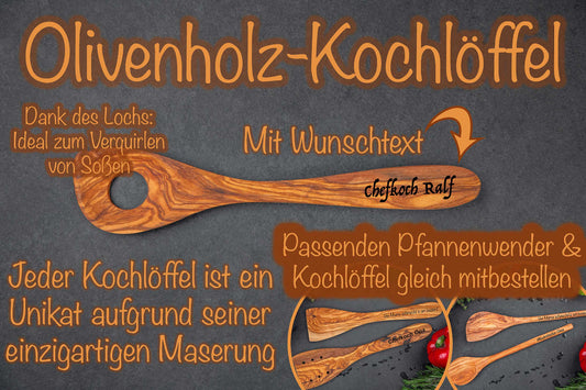 Olivenholz-Kochlöffel mit Deiner Wunschgravur und Loch
