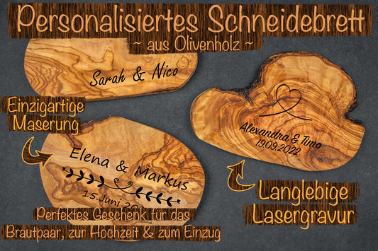 Olivenholz Frühstücksbrett mit Wunschgravur - Hochzeitsgeschenk personalisiert