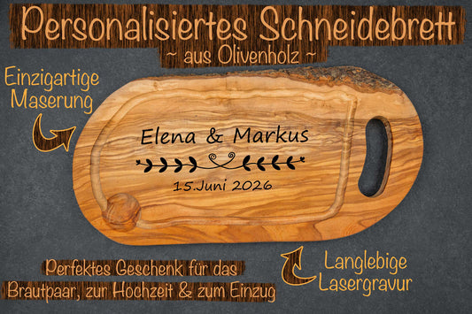Schneidebrett aus Olivenholz mit vielen Motiven und Wunschgravur - Hochzeitsgeschenk