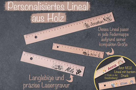 Lineal mit Wunschname aus Holz und vielen Motiven