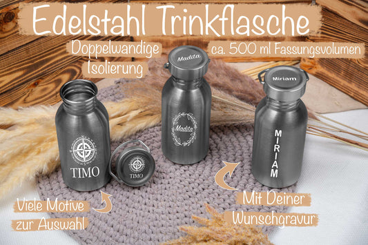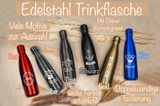 Edelstahl Trinkflasche personalisiert mit Namen - Isolierflasche in sechs Farben