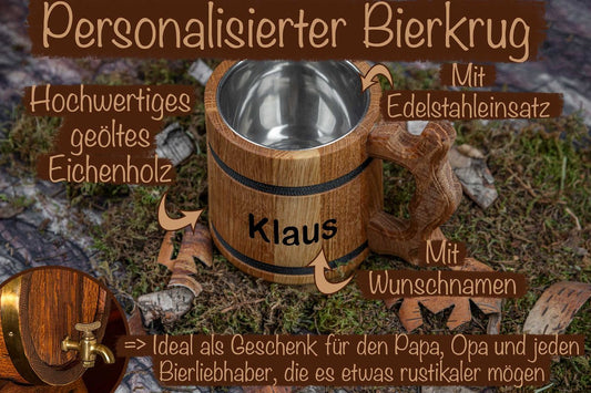 Rustikaler Bierkrug personalisiert aus Eichenholz mit Edelstahleinsatz