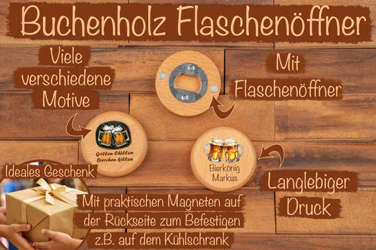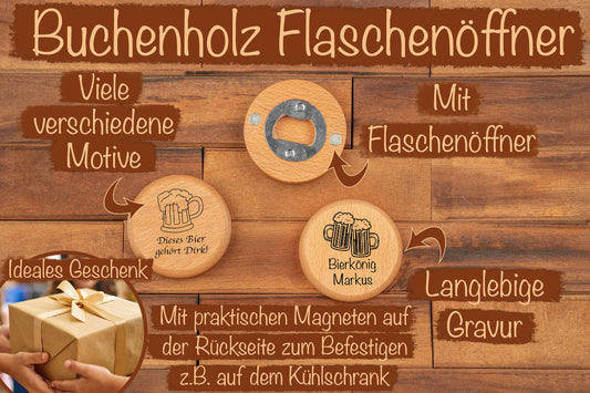 Runder Flaschenöffner personalisiert aus Buchenholz