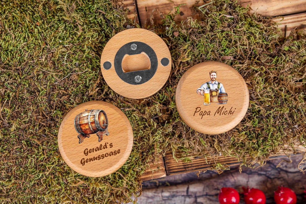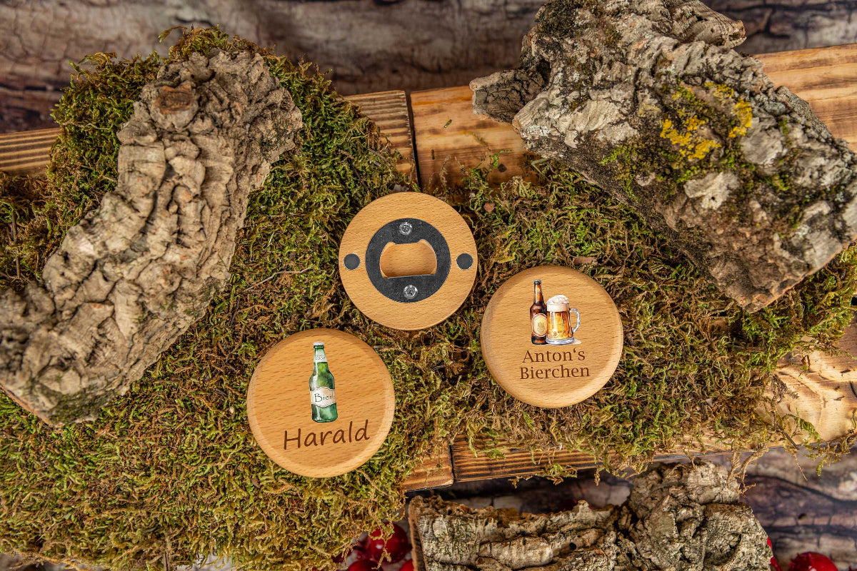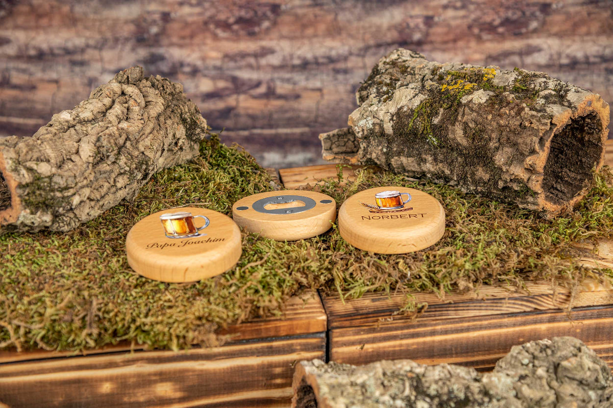 Flaschenöffner Buchenholz rund personalisiert bunt