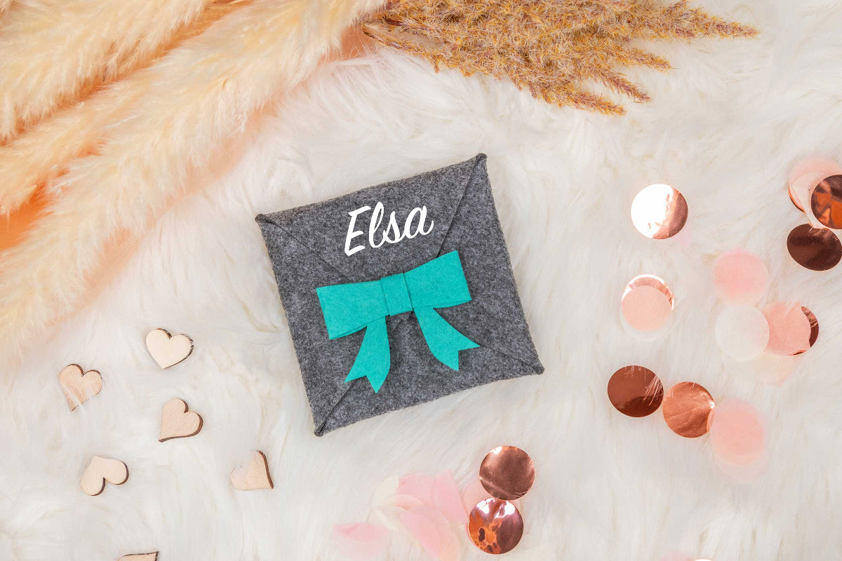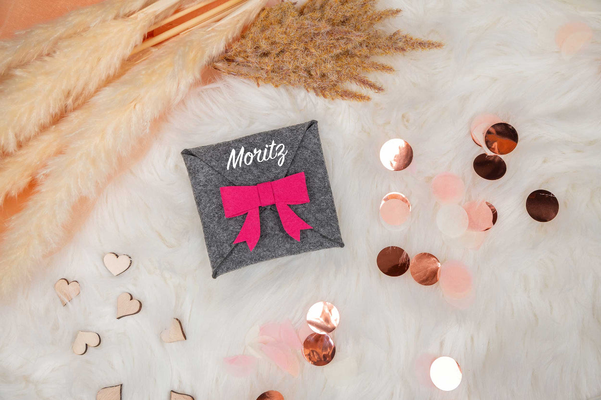 Du bist auf der Suche nach einem besonderen Geldgeschenk? Dann haben wir hier das Richtige für Dich, unser personalisiertes Mini-Täschchen mit Schleife.😇