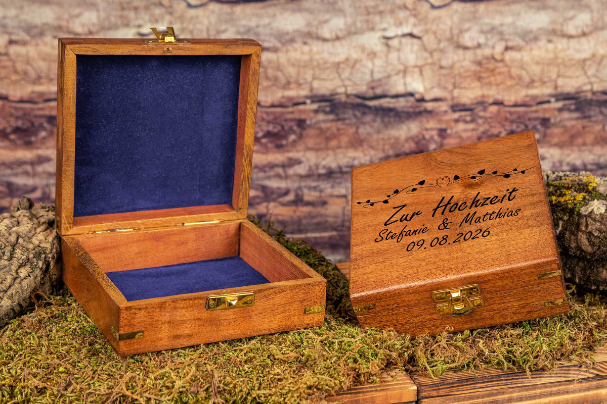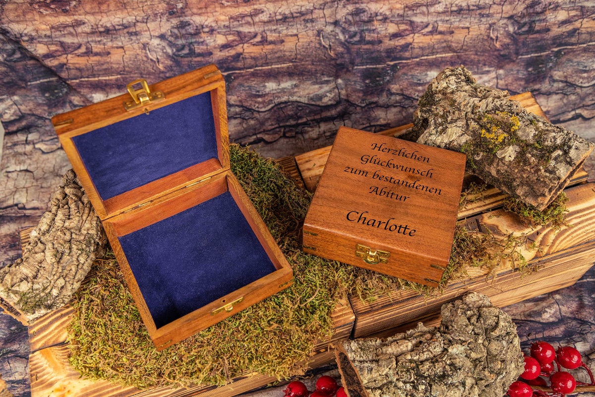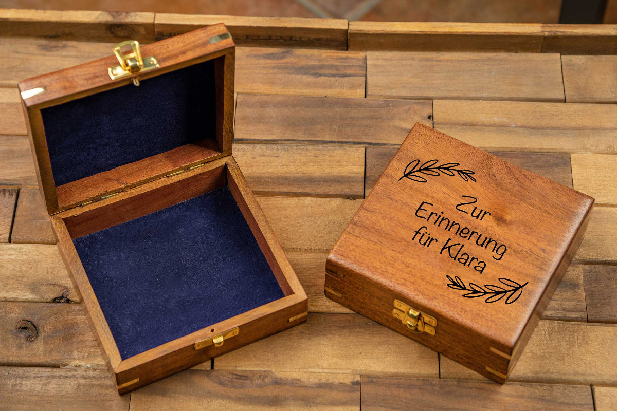 Unsere kleine Schatztruhe ist eine besondere Geschenkverpackung für kleine Überraschungen. Die individuelle Gravur macht jede Holzbox zu einem einzigartigem Einzelstück.
