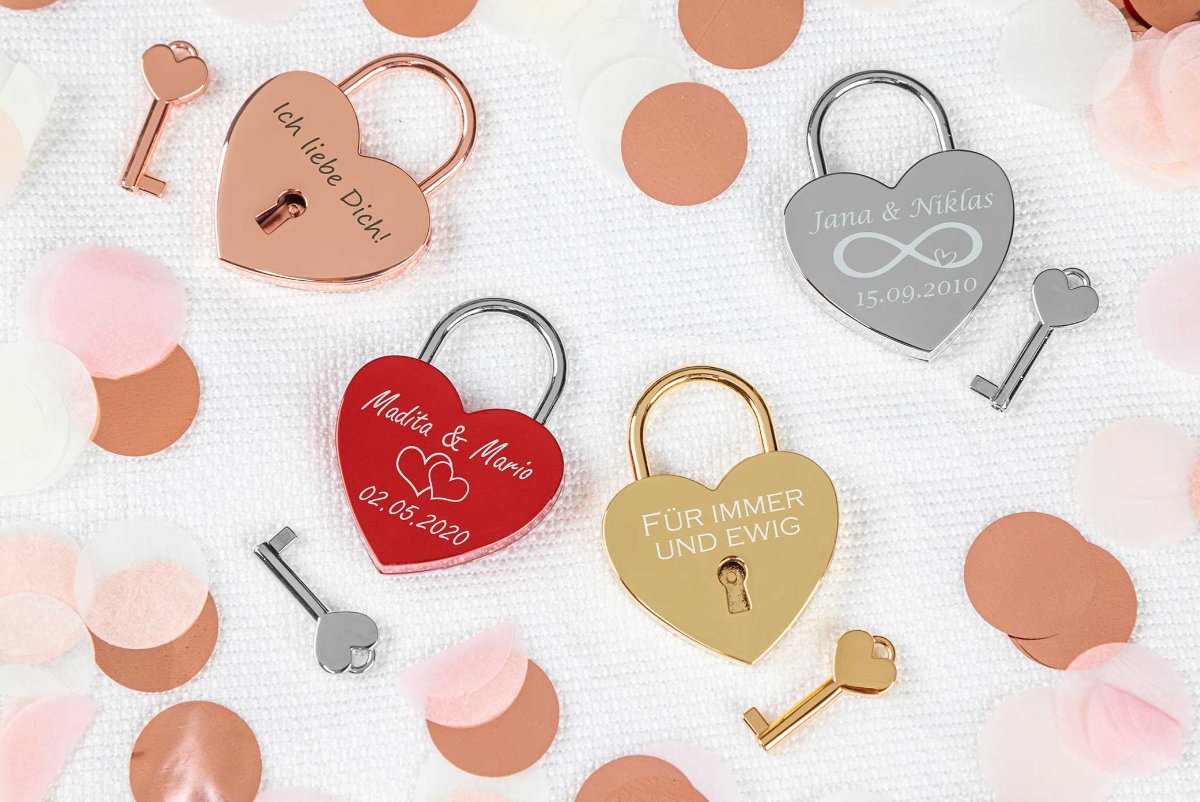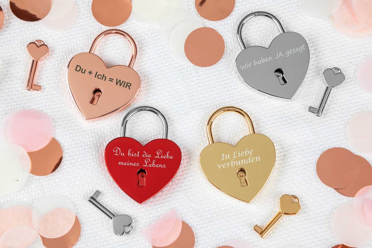 Liebesschloss mit Gravur personalisiert in Herzform in vier Farben