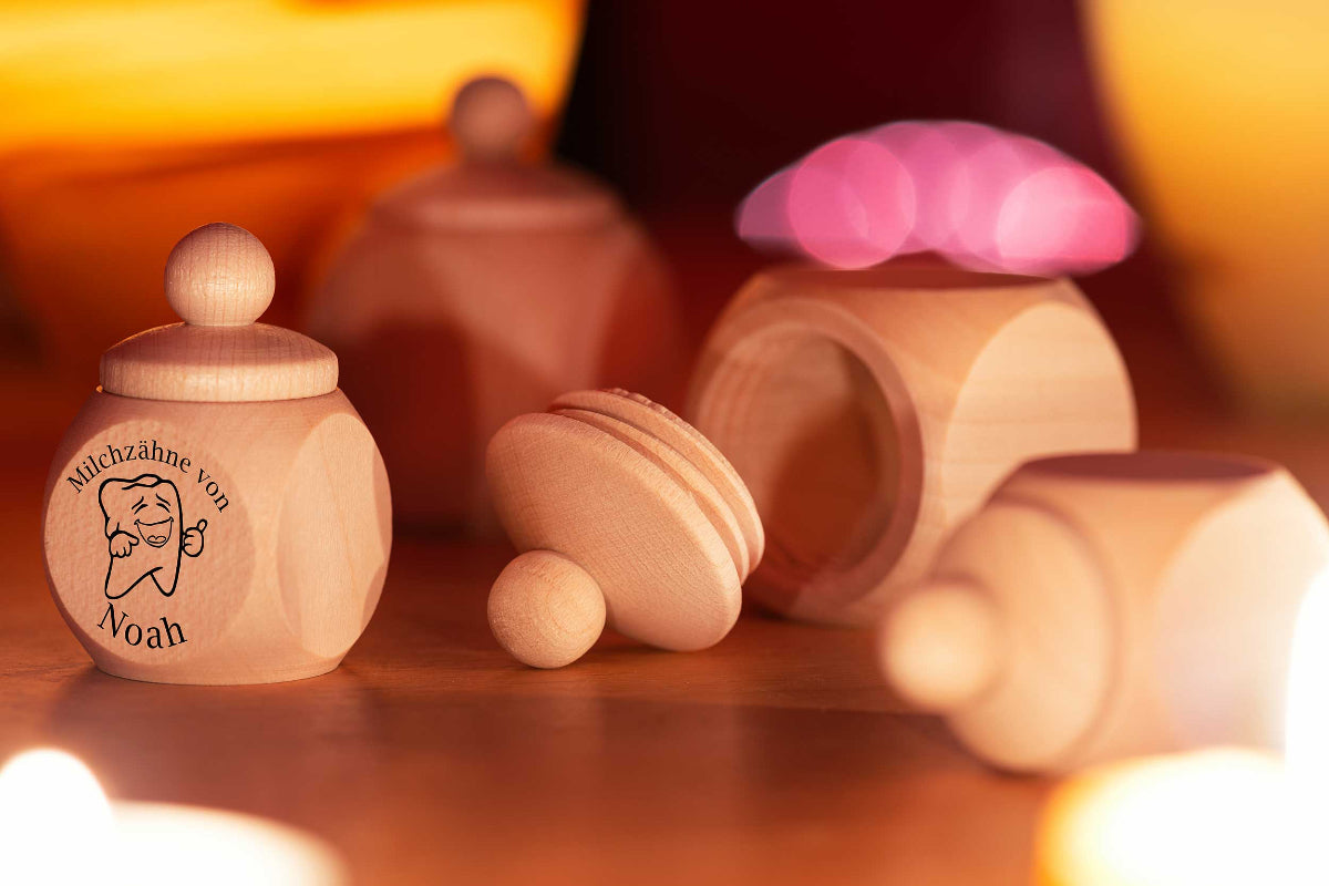 Hier geht's zu unserer runden Milchzahndose aus Buchenholz >
