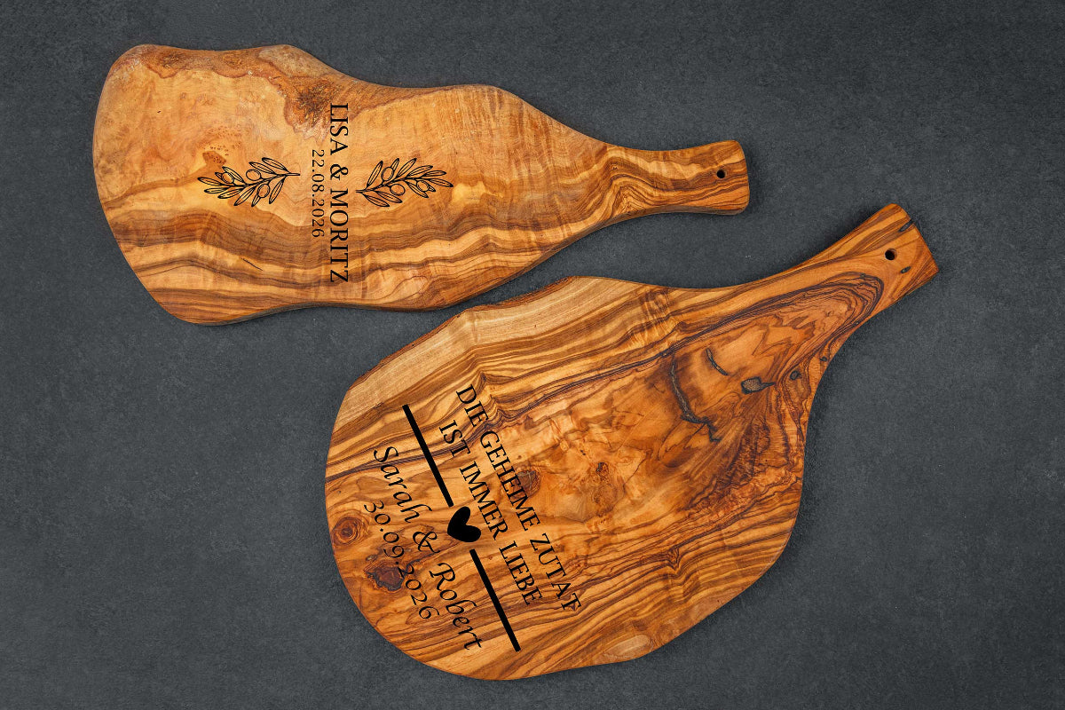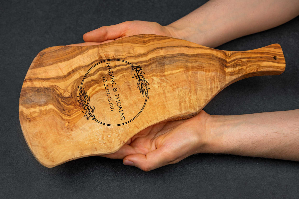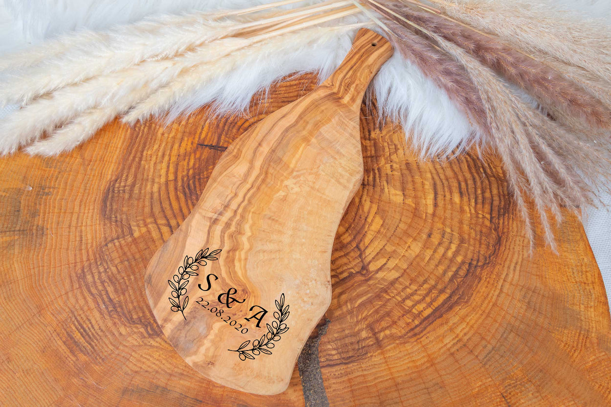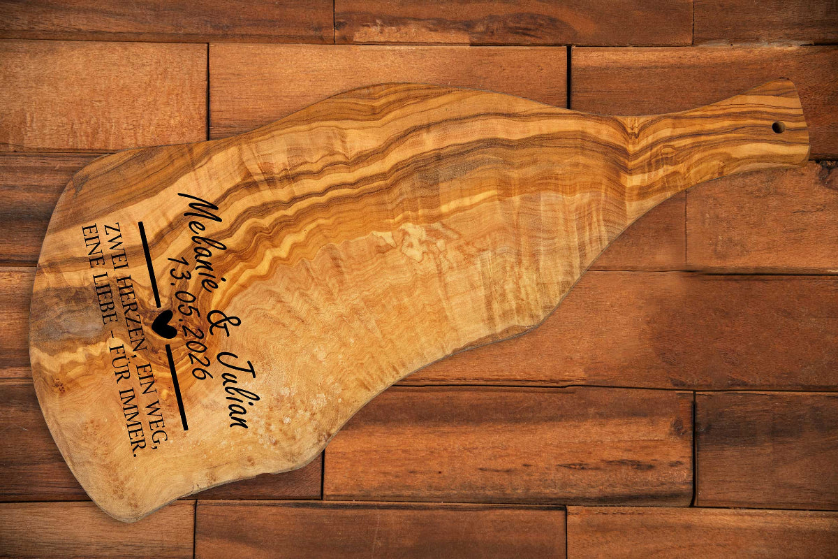 Olivenholz Brett mit Wunschgravur und Griff - Hochzeitsgeschenk