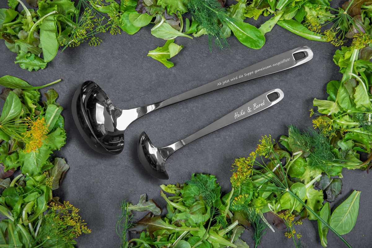Die Gravur „Ab jetzt wird die Suppe gemeinsam ausgelöffelt“ sorgt für ein Schmunzeln und unterstreicht auf humorvolle Weise die Verbundenheit des Paares.