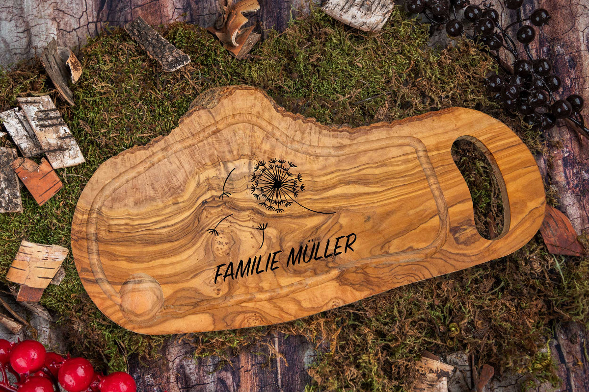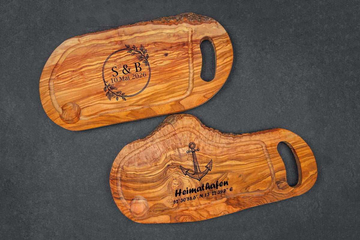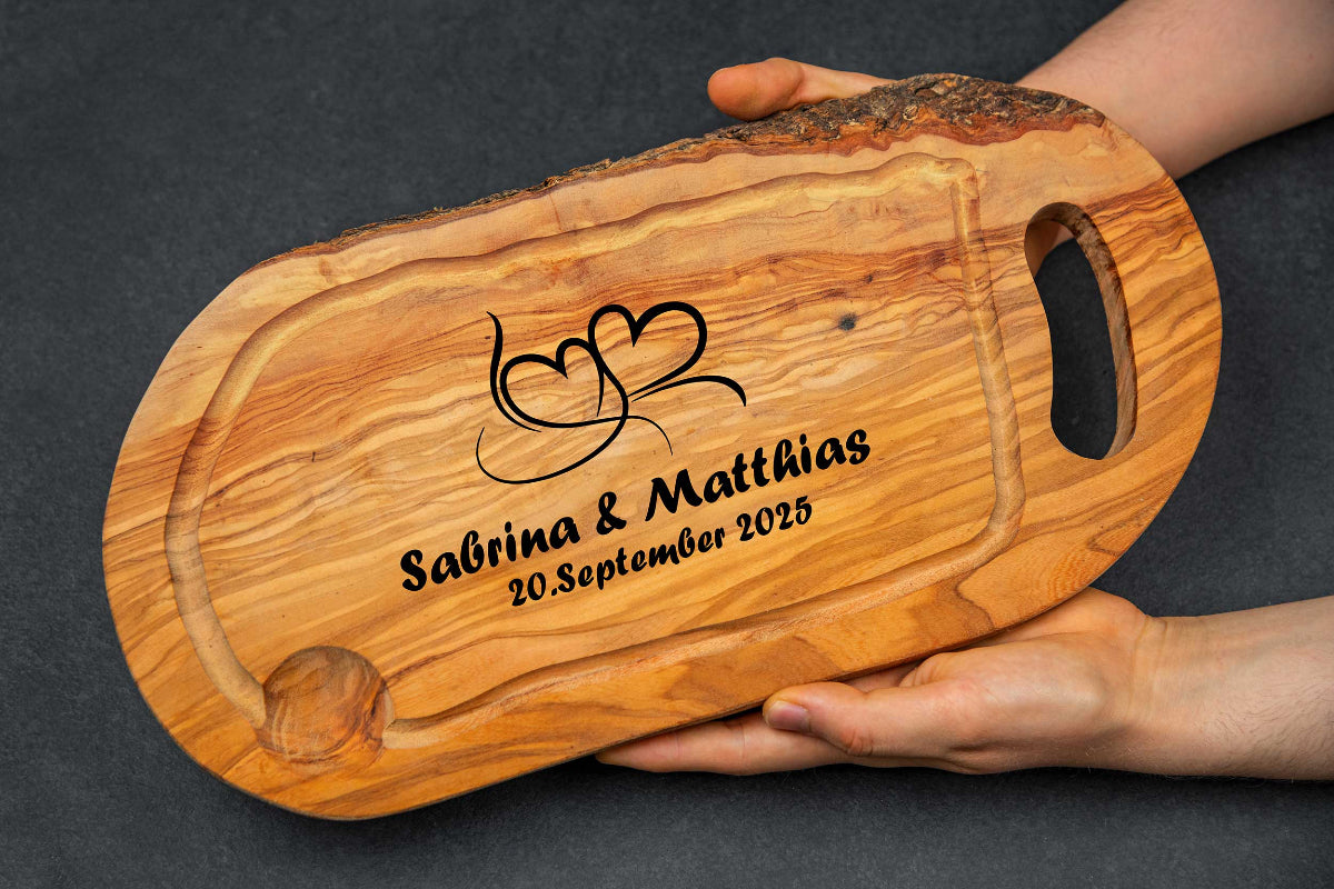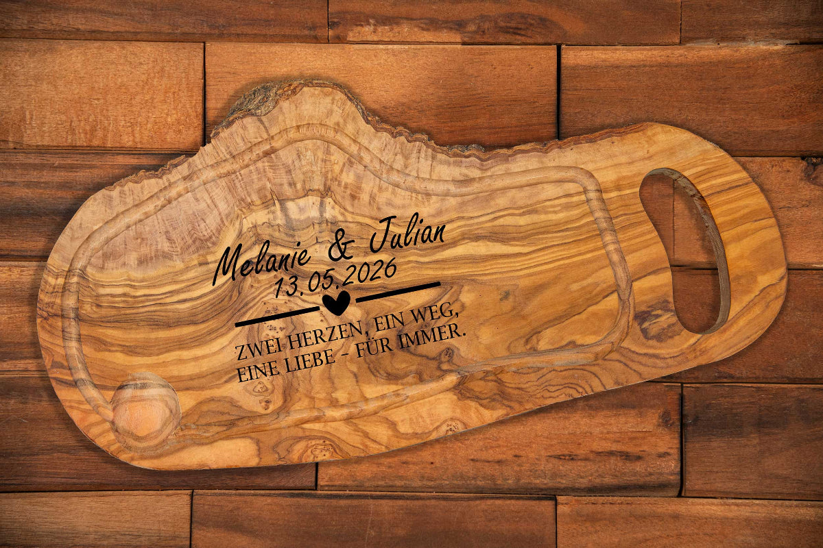 Schneidebrett aus Olivenholz mit vielen Motiven und Wunschgravur - Hochzeitsgeschenk