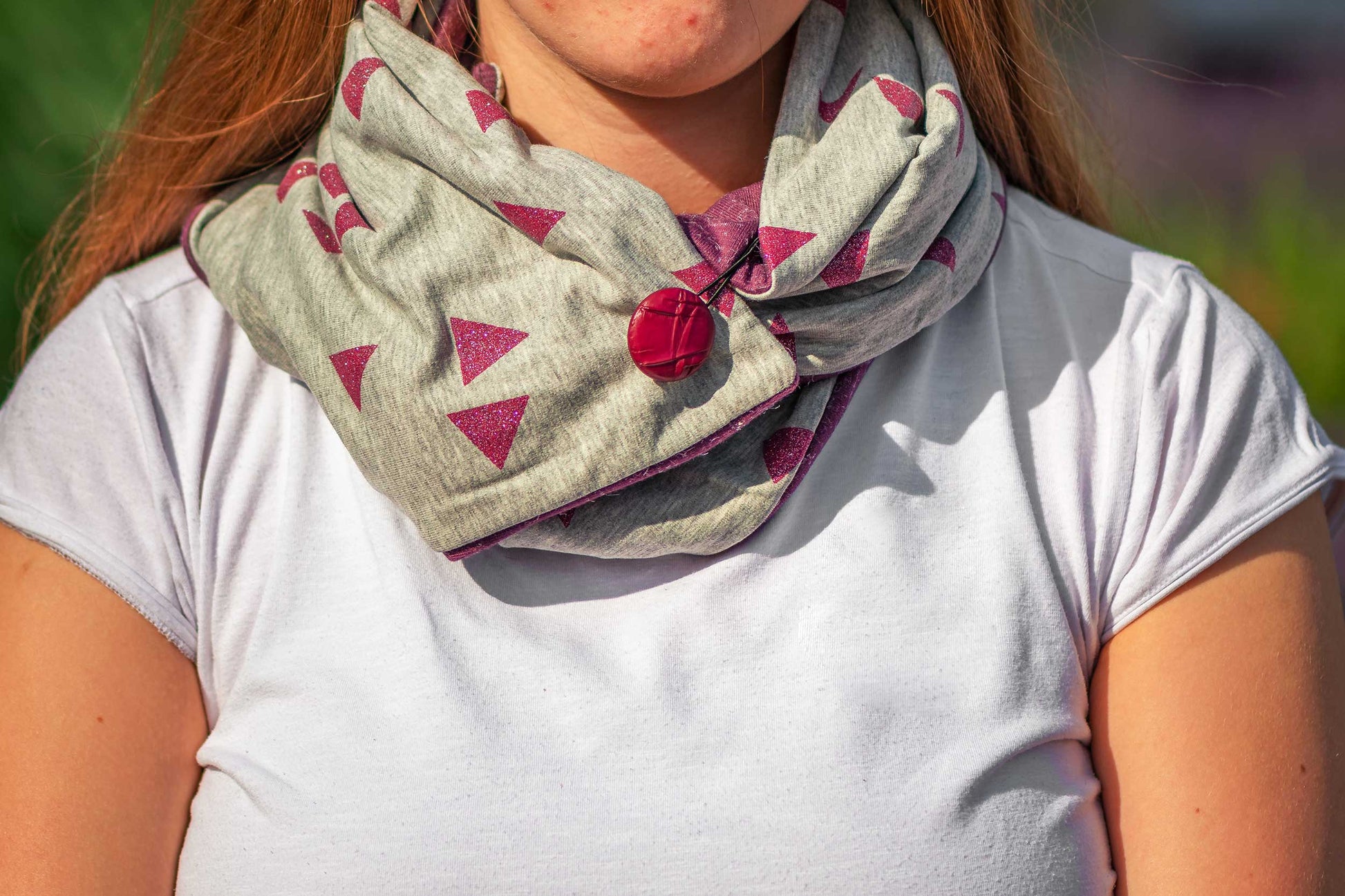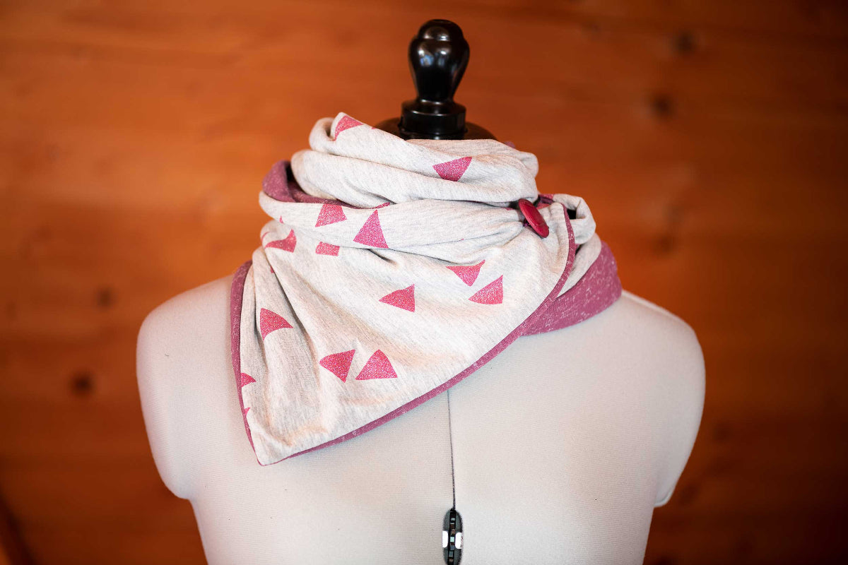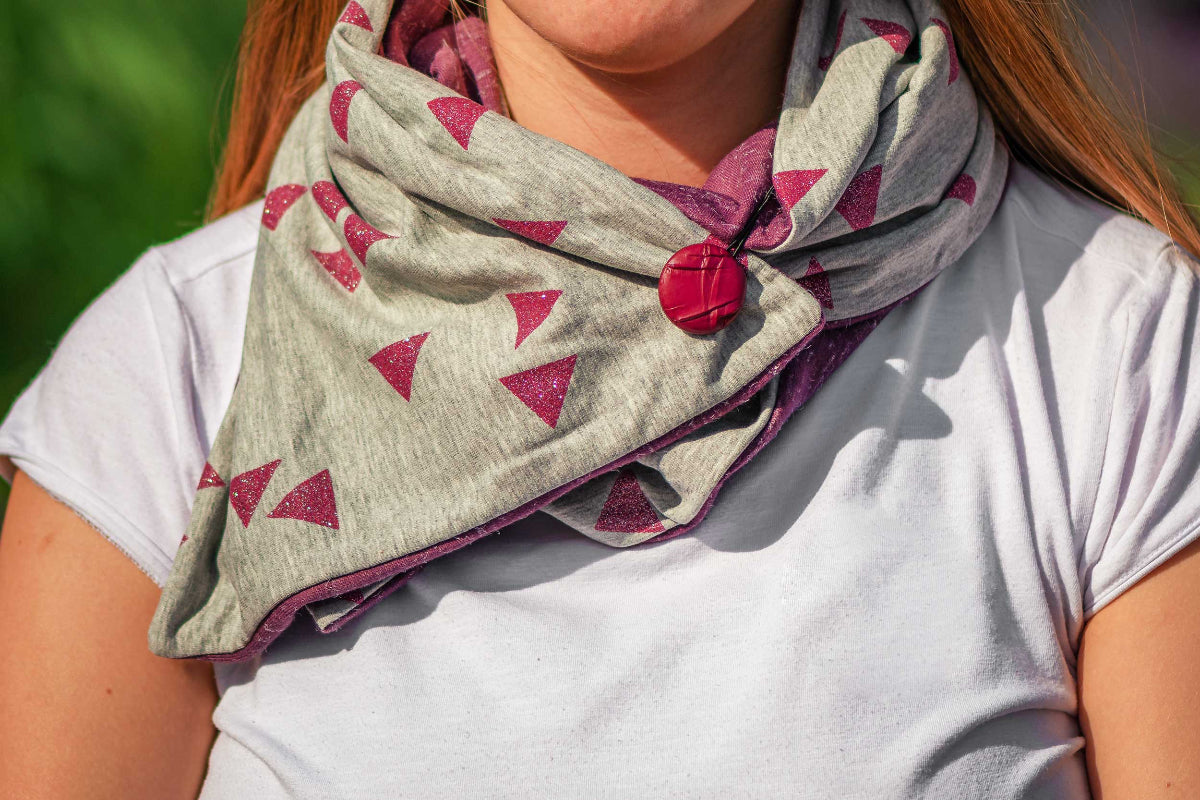 Der Schal wird aus einem Baumwolle-Jersey und einem passenden Uni-Stoff hergestellt.