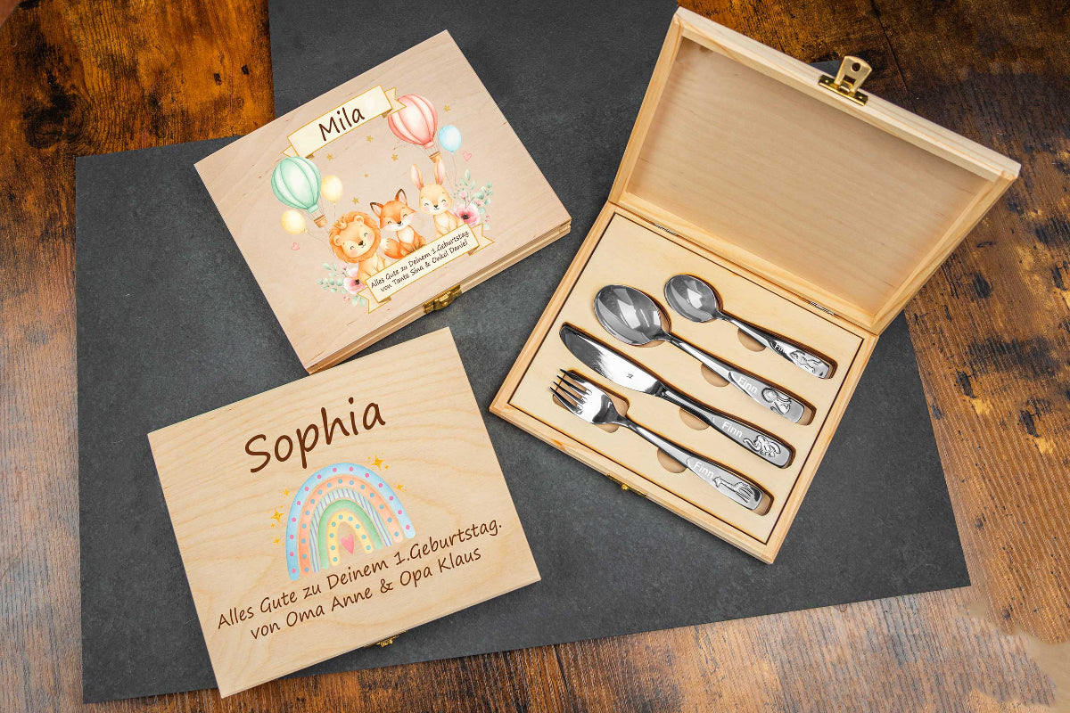 WMF Kinderbesteck Tiere mit bunter Holzbox und Gravur